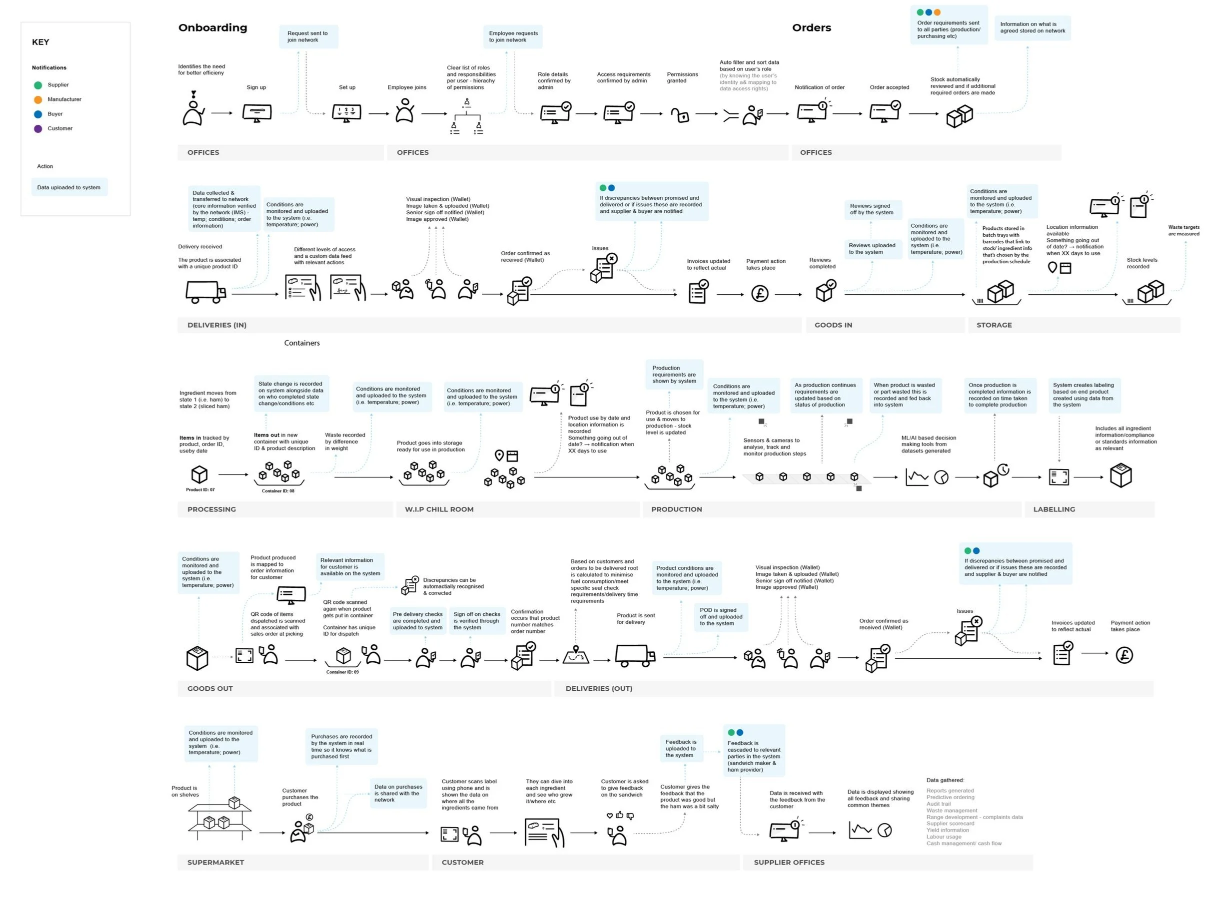 As part of an Innovate UK funded project, we fused IoT, Blockchain and AI to improve productivity, traceability and reduce waste. Current solutions cannot trace ingredients back to their original source. To do this, we needed to know what happens inside each business and track the movement and conversion of each item.